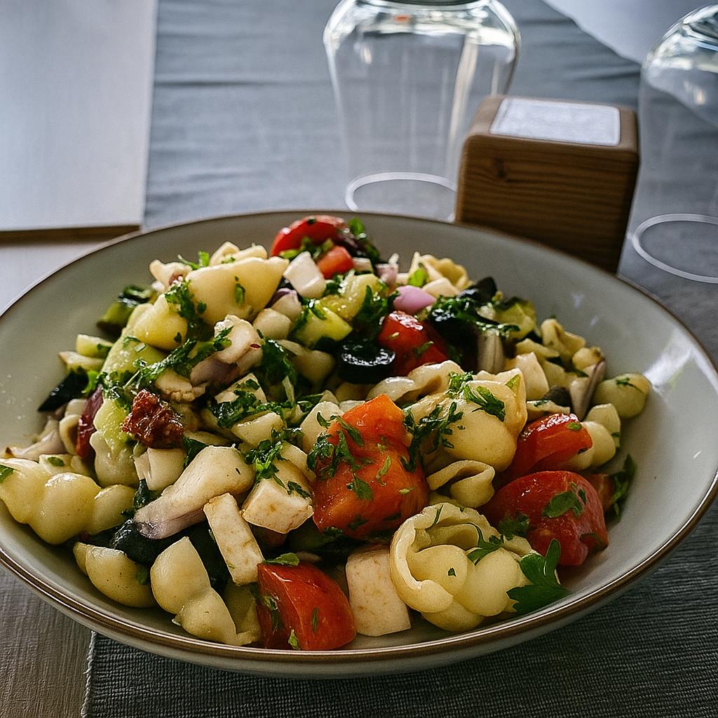 A fresh, vibrant Mediterranean salad featuring olives, tomatoes, cucumbers, feta cheese, and often a light dressing.